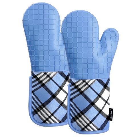 Un paio di motivi geometrici A scacchi texture in silicone antiscivolo cucina blu guanti da forno barbecue anti-scottatura